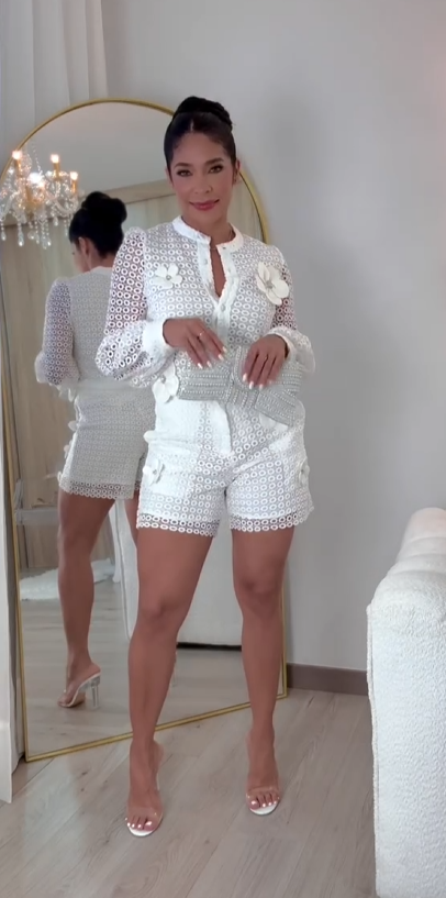 O Conjunto Suelen é sinônimo de requinte e personalidade. A blusa traz um ar romântico com sua manga longa transparente e aplicação floral em alto relevo no busto, que adiciona textura e charme à peça. Já o short vem com uma modelagem estruturada e bolsos cargo que equilibram feminilidade e atitude.