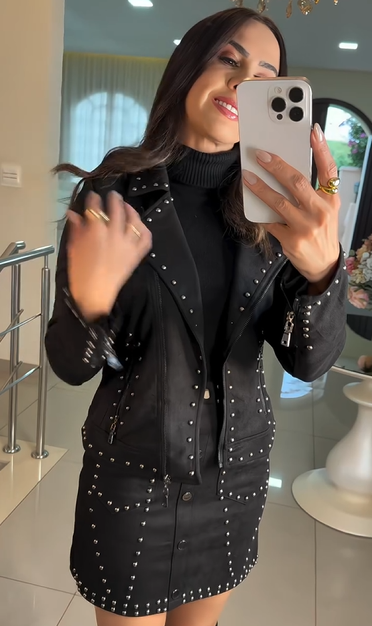 Look urbano e poderoso! Jaqueta estilo biker com lapelas e aplicações de tachas metálicas + saia mini de cintura alta com botões frontais e bolsos com lapela. Modelagem encorpada com leve elasticidade que valoriza a silhueta — perfeito com botas para noite, shows e produções fashion.