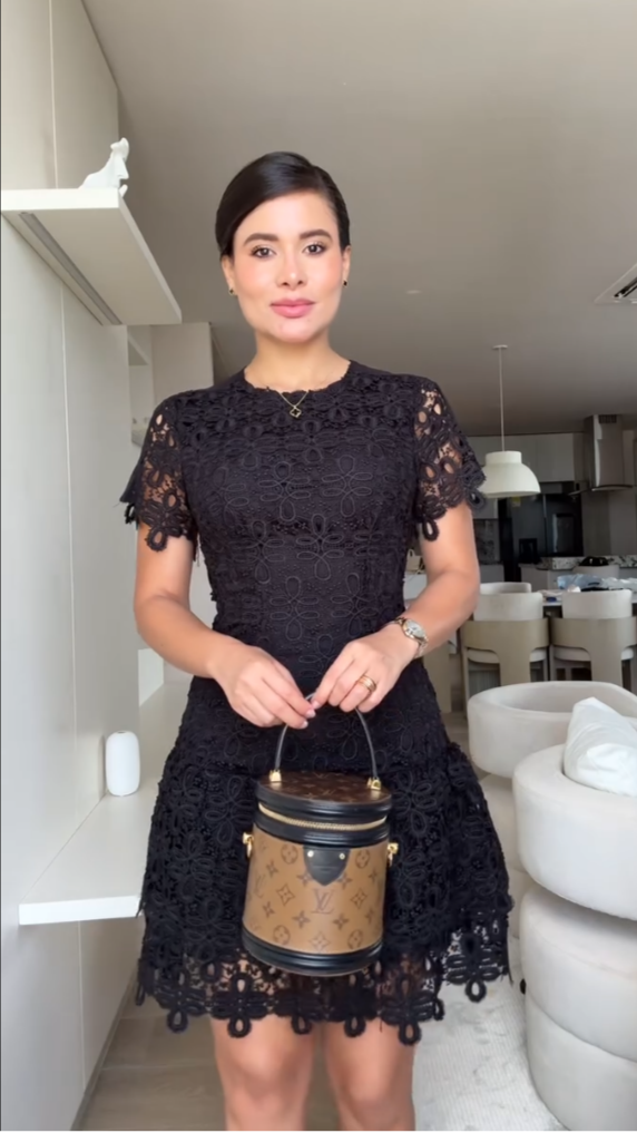 Com caimento acinturado e saia levemente evasê, valoriza a silhueta de forma sutil. O comprimento curto traz modernidade, enquanto o acabamento em renda nas mangas e barra adiciona um toque clássico e refinado.